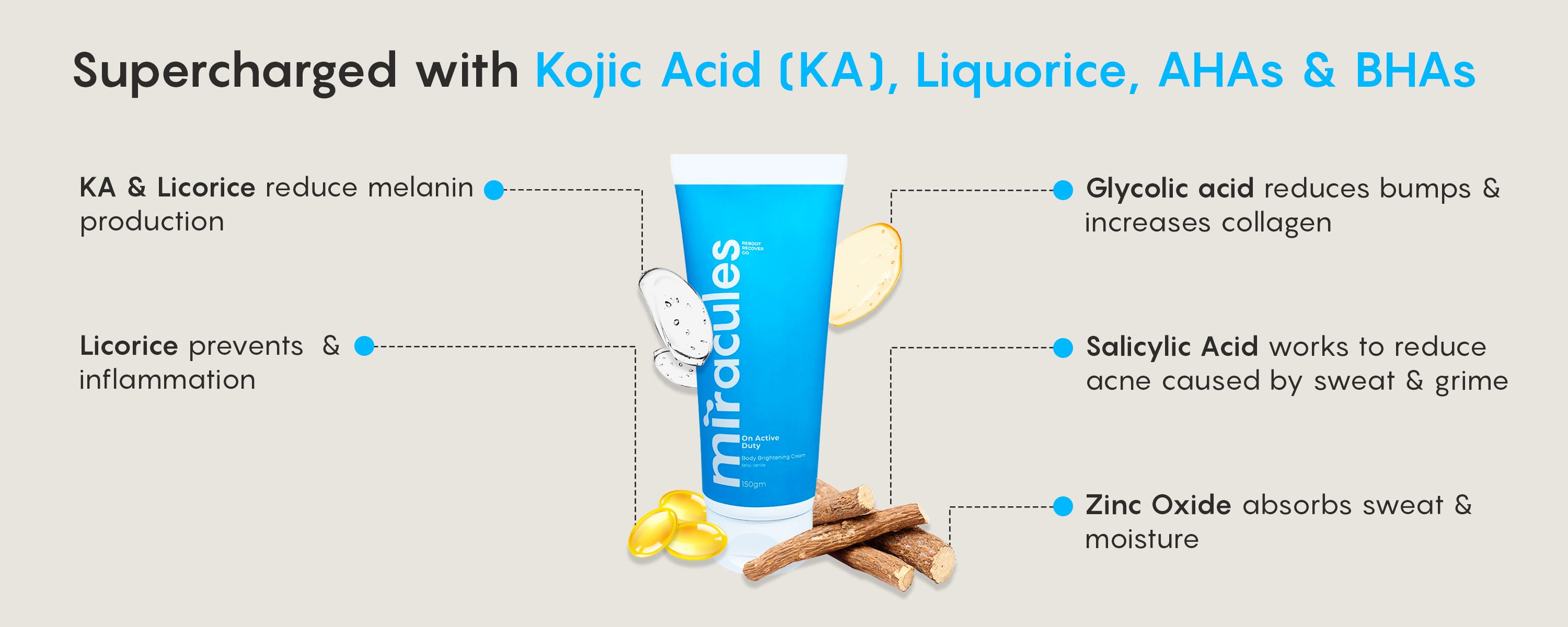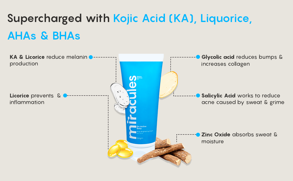 1. Body Brightening: Liquorice Extract , Kojic Acid and Niacinamide work in tandem to reduce pigmentation. For those who are new to liquorice, this ingredient boasts of depigmenting properties that (some studies claim) can reverse pigmentation caused by UV B rays.